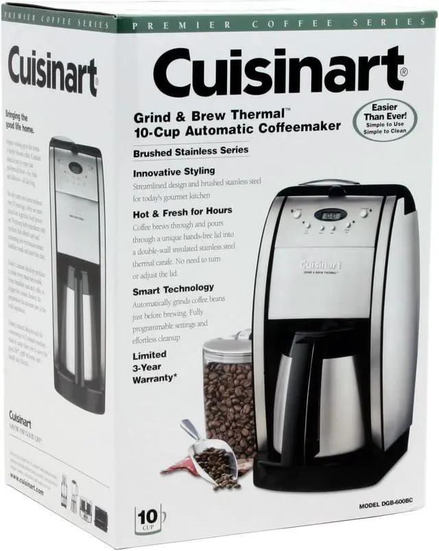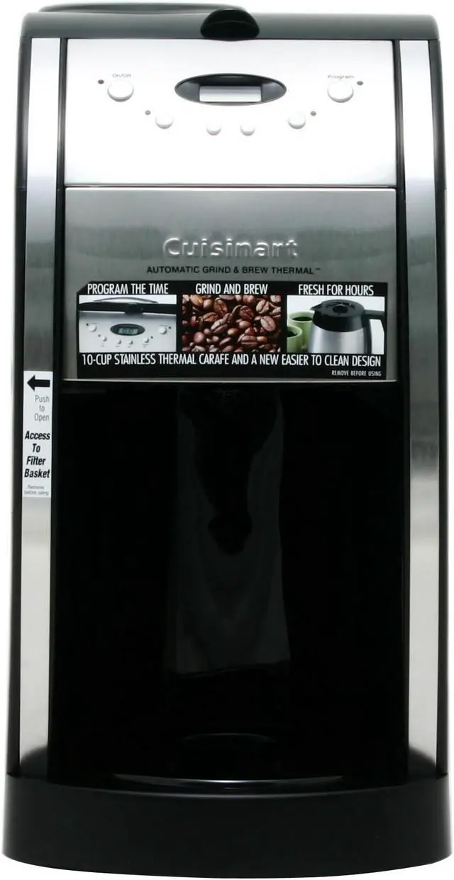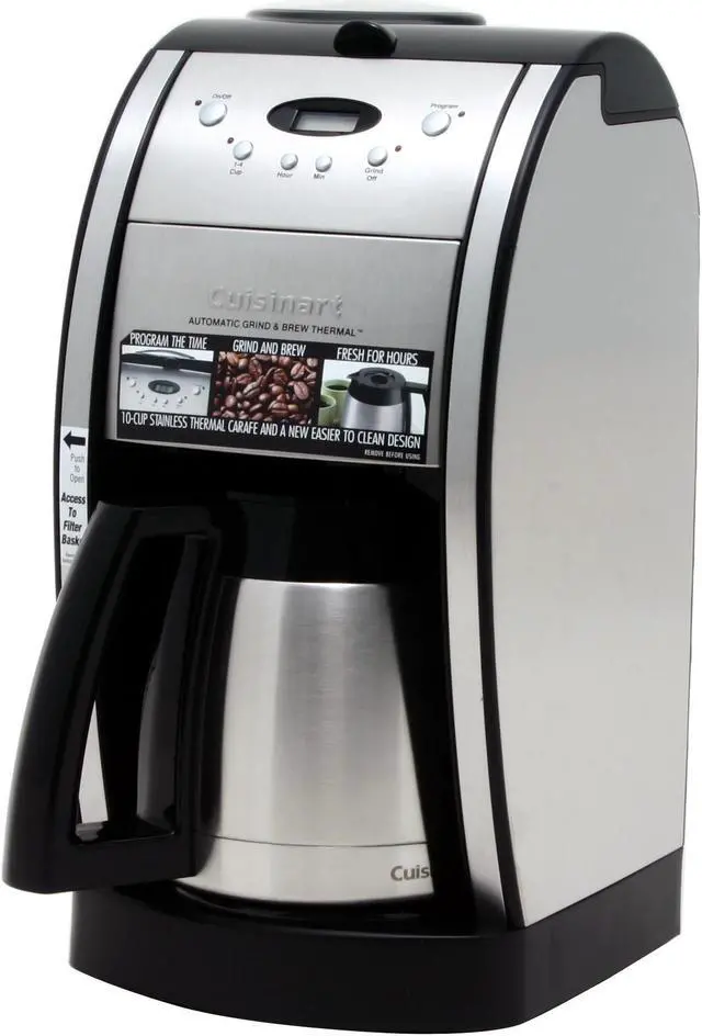 Features Cuisinart Grind & Brew Thermal Coffeemaker grinds your favorite beans just before brewing. A double-wall, insulated, brushed stainless steel, thermal carafe keeps up to 10 cups of coffee hot for hours. The elegant European design creates the perfect look for today's gourmet kitchen.