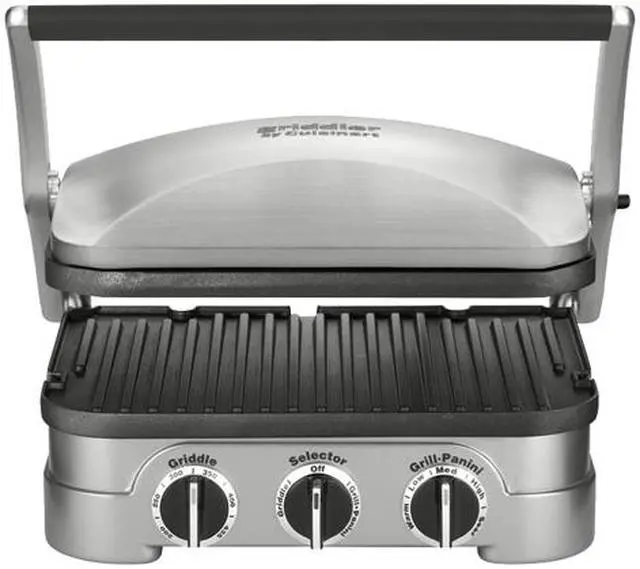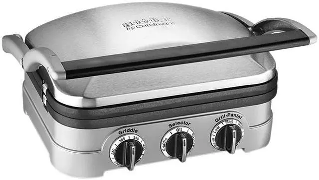 Five Appliances in OneWith two reversible nonstick plates, this unit can be used as a contact grill, panini press, flat grill, griddle, or half grill/half griddle. Use the selector knob to choose the grill or griddle function. The sturdy panini-style handle, with a floating hinge, adjusts to the thickness of your food.