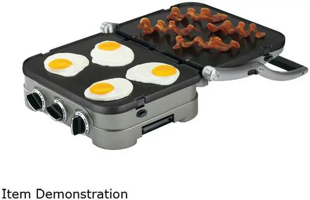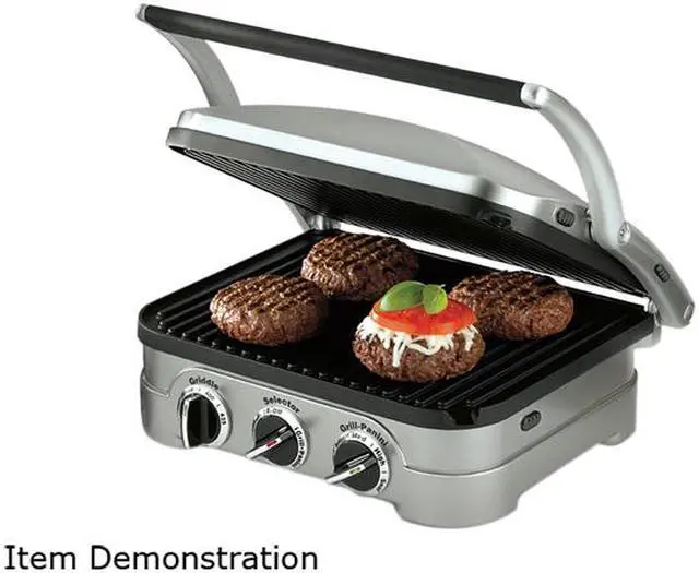 A blend of function and style, the Cuisinart CGR-4NC is a great appliance for the modern kitchen. Its brushed stainless steel housing with embossed logo fits in any decor, and the unit is also easy to clean. A floating cover, and a set of reversible plates that snap in and out, turn the Griddler into a Contact Grill, a Panini Press, a Full Grill, a Full Griddle, or Half Grill/Half Griddle. So it can handle everything from pancakes and sausages to grilled cheese, steaks, hamburgers, and panini. Dual temperature controls ensure everything is perfectly cooked!