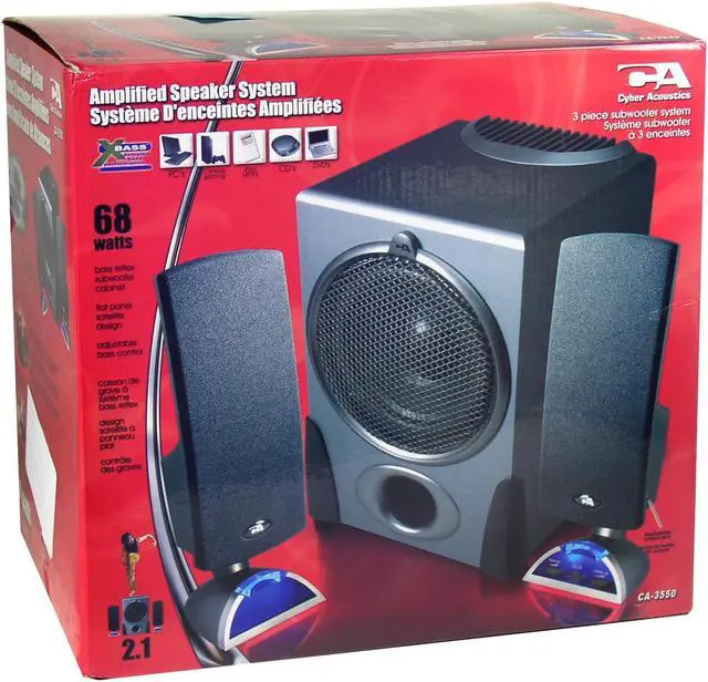 | Features | Convenient desktop controls: On/off switch Master volume Bass volume Illuminated power on indicator on satellites Cloth grill cover Magnetically shielded satellite speakers Acoustic balanced wood cabinet subwoofer Bass reflex, ported enclosure on subwoofer Headphone output jack Video game adapter cable included |