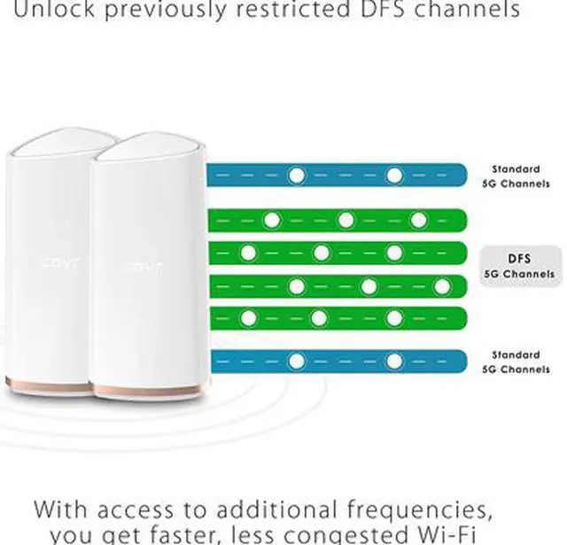 Unlike most other routers, COVR-2202 lets you unlock previously restricted DFS channels on the 5 GHz spectrum. With access to additional frequencies which have next-to-no congestion, you get faster, less congested Wi-Fi—even if you're completely surrounded by networks and devices around your home.