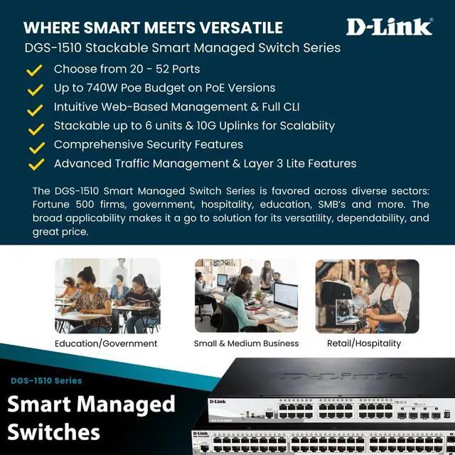 D-Link DGS-1510-28XMP Systems 28-Port Gigabit SmartPro Stackable PoE/PoE+ Switch Including 4 10GbE SFP+ Ports