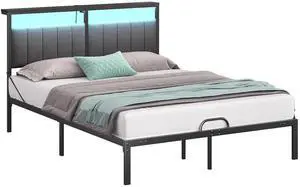 Bestier Queen Bed Frame with Upholstered Headboard, Metal Platform Bed with LED Lights & USB Ports, Gray