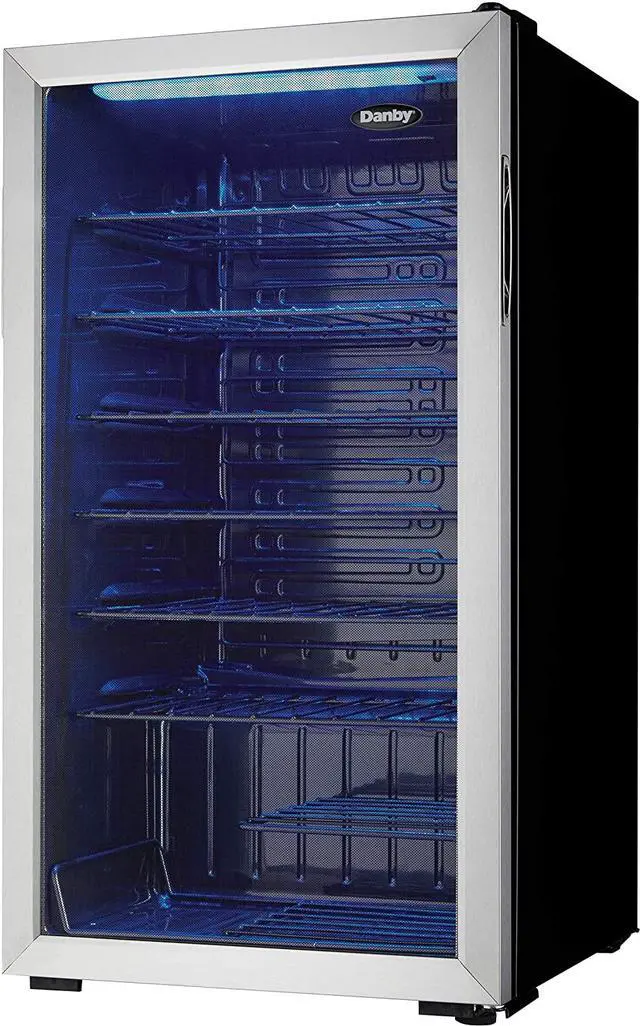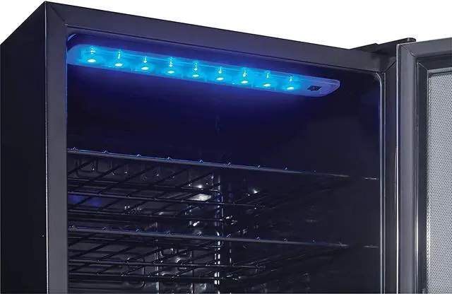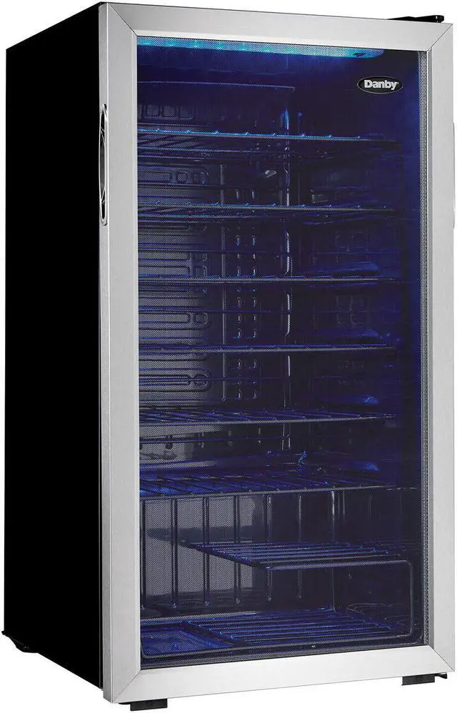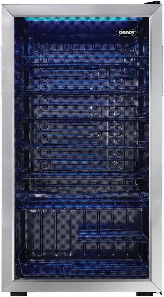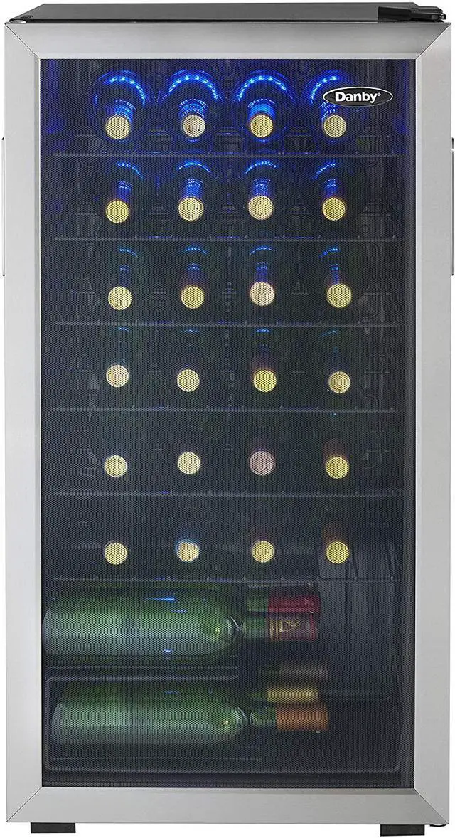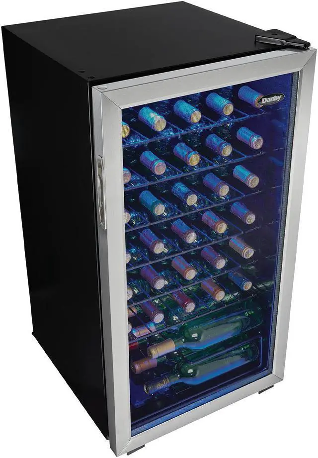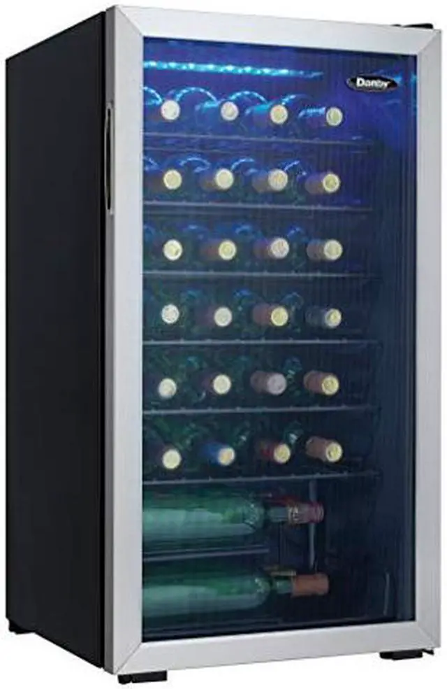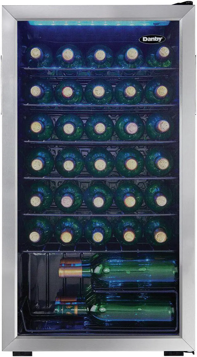 When you have several bottles of wine that need to be cooled, the most convenient and economical way to store them is in a fashionable free-standing wine cooler such as this model from Danby. This spacious unit offers 3.3 cubic feet of cooling space which is designed to store up to 36 bottles of your favorite wines on attractive black wire shelving units. Your collection will also look quite impressive due to the blue LED interior lighting which beautifully showcases the bottles through the elegant tempered-glass door. The bottles will always be at the temperature you prefer since the range of the wine cooler lies between 43F and 57F (6C and 14C).