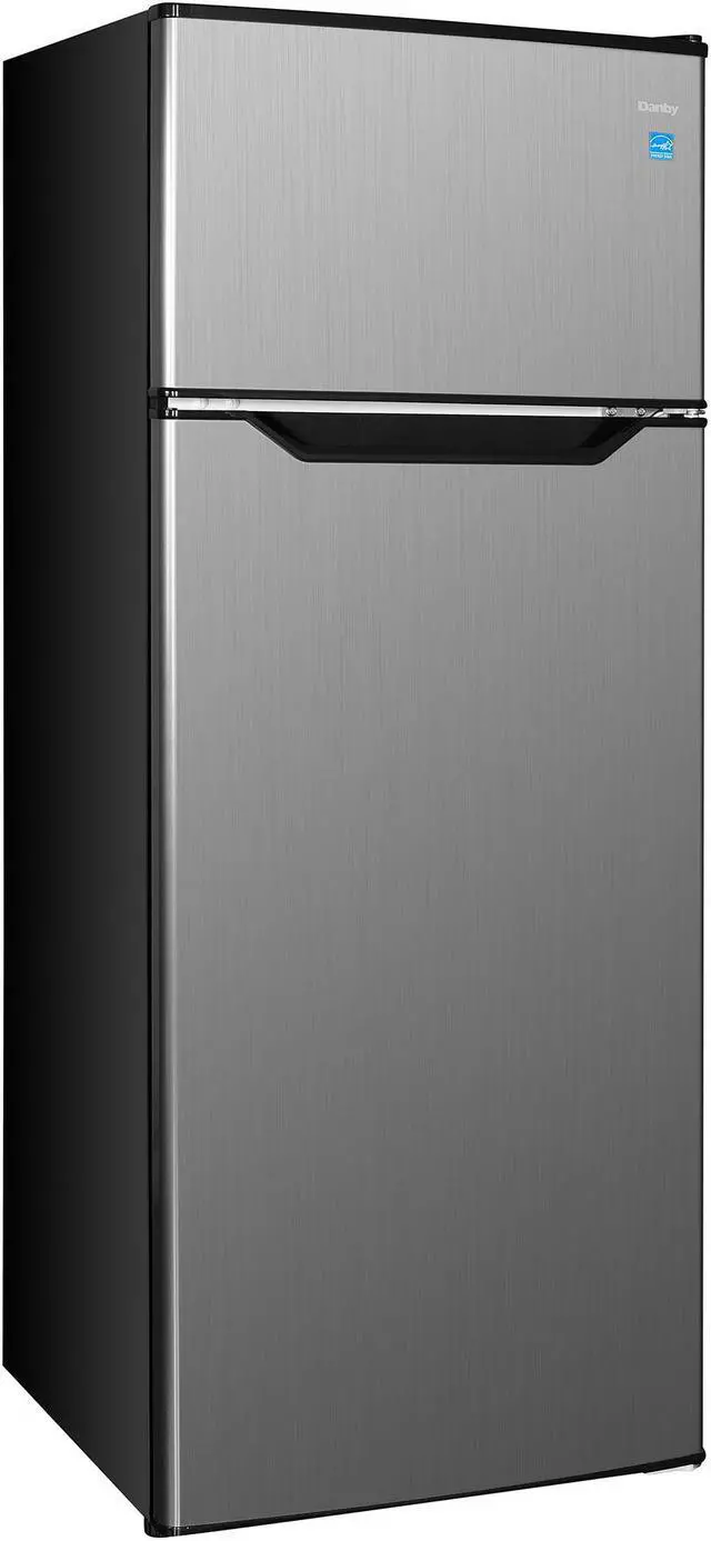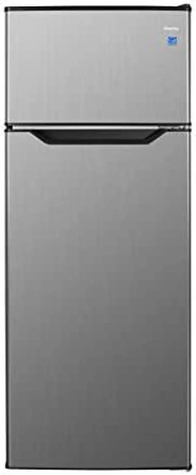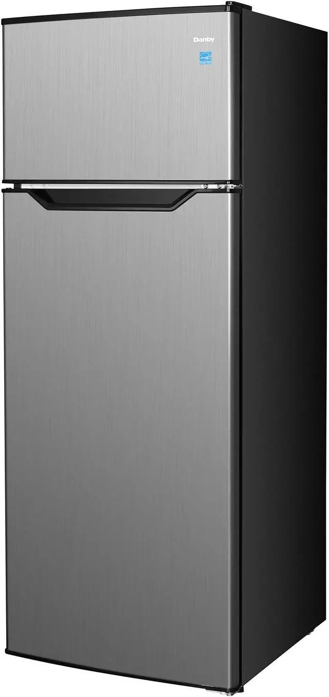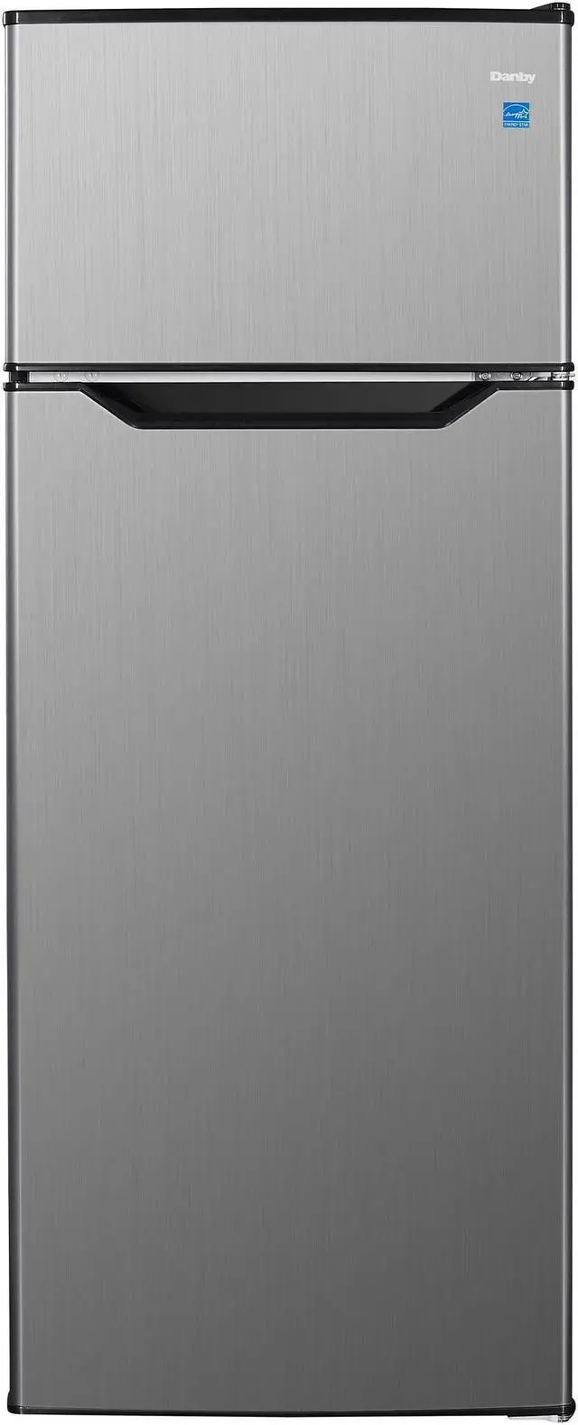 Discover the styling and simplicity of Danby’s 7.4 cubic feet (210 L) stainless-steel top-mount refrigerator, perfect for small spaces such as condo, apartment, and townhouse! Reduce your electricity bill and save on energy with this ENERGY STAR rated model. Avoid clutter with two adjustable glass shelves in the fridge and a top-mount freezer section with one adjustable wire shelf. This model also comes with a transparent crisper bin to keep all your favorite vegetables and fruit fresh. Its reversible door hinge allows for a right- or left-hand swing so you can fit this unit in almost any space, while its three-door shelves and tall bottle storage make it easy to keep your fridge organized. Choose automatic defrost for the refrigerator and manual defrost for the freezer compartment for easy maintenance all year round.