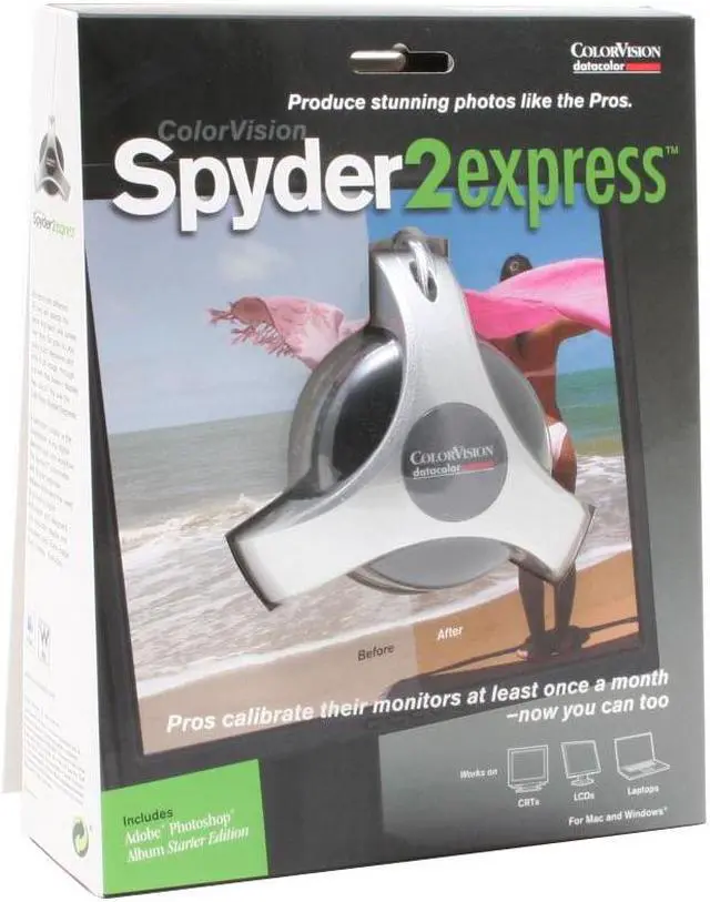 Calibrate your display just like professionals. Spyder2express calibrates monitors in three easy steps: simply plug it in, specify your display type and it does the rest, automatically calibrating your monitor or laptop. New state of art optical science provides a five-fold increase in color sensitivity over previous technology with a patent-protected light baffle for accurate characterization of LCD displays.