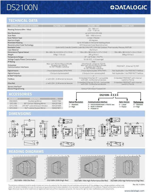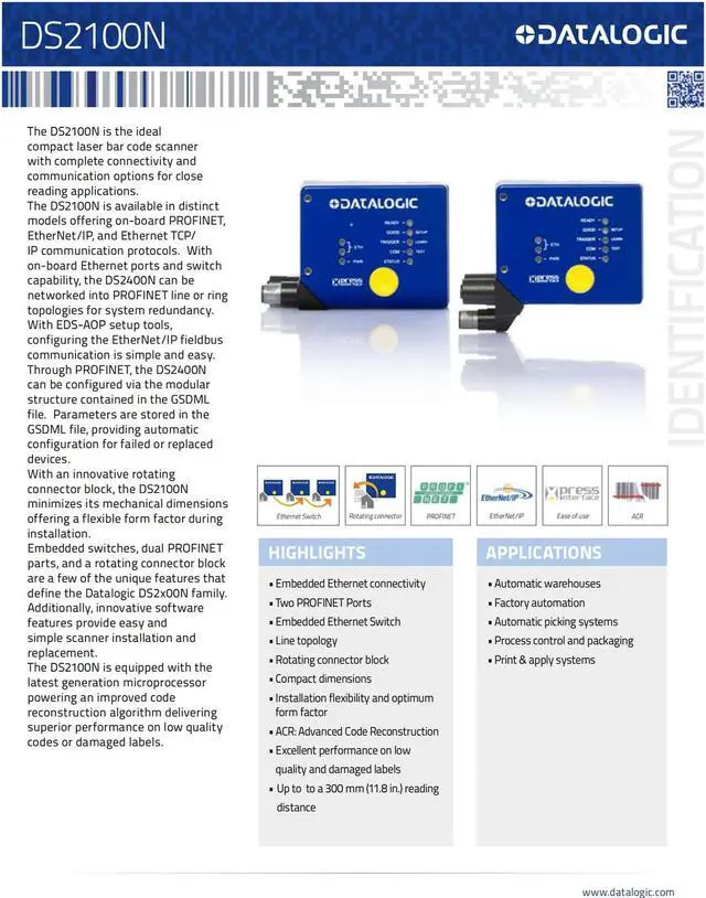The DS2100N is available in distinct models offering on-board PROFINET, EtherNet/IP, and Ethernet TCP/ IP communication protocols.