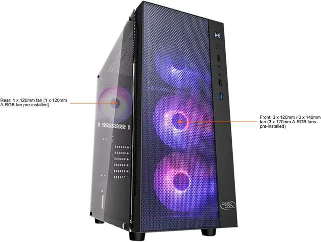 | Fan Options | Front: 3 x 120mm / 3 x 140mm fan (3 x 120mm A-RGB fans pre-installed) Top: 2 x 120mm / 2 x 140mm fan Rear: 1 x 120mm fan (1 x 120mm A-RGB fan pre-installed) |