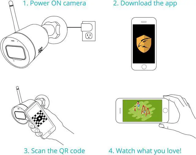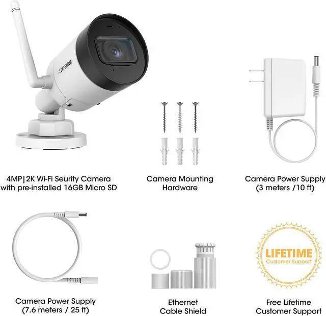 1 x Wireless 4MP Wi-Fi Camera 3 x Camera Mounting Screws 1 x Waterproof Ethernet Connector 1 x Camera Power Supply (3 meters/10ft) 1 x Power Extension Cable (25ft) 1 x Quick Start Guide Free Lifetime Access to the Guard App Free Lifetime Customer Support