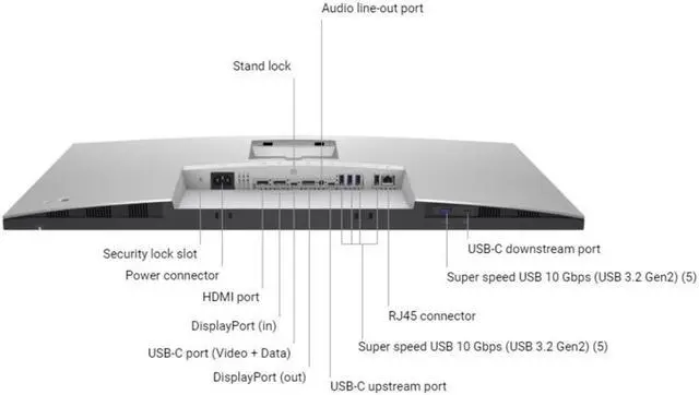 - Ports: HDMI (HDCP 2.2), DisplayPort 1.4, DisplayPort output, USB-C upstream/DisplayPort 1.4 Alt Mode with Power Delivery (power up to 90W, HDCP 2.2), USB-C 3.2 Gen 2 upstream, USB-C 3.2 Gen 2 downstream (power up to 15W), 4 x USB 3.2 Gen 2 downstream, USB 3.2 Gen 2 downstream with Battery Charging 1.2, Audio line-out (mini-jack), LAN (RJ-45)