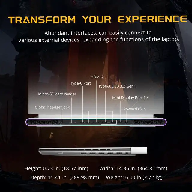 • Windows 11 Pro: 14.36x11.41x0.73 inches, 6 lbs. Ports: 2x USB Type-A, 2x USB Type-C, 1x Mini Display Port 1.4, 1x SD Card Reader, 1x Power Jack, 1x Headset Jack, 1x HDMI 2.1. Wi-Fi 7 + Bluetooth, Silver.