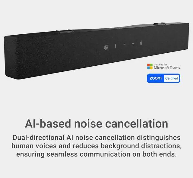 This soundbar is compatible with leading UC platforms and certified for Microsoft Teams and Zoom.