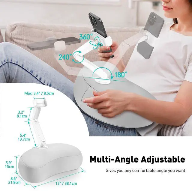 Unmatched Adjustability: With a 360° rotating support arm, 240° middle axis rotation, and 360° adjustable clamp, the DeskLogics cell phone stands allows you to find the perfect angle every time. Its ability to rotate and pivot in multiple directions makes it suitable for any positionwhether youre sitting up, lying down, or lounging on the sofa or bed. The pillow stand provides a stable and flexible phone-holding solution, ensuring that your device stays securely in place.
