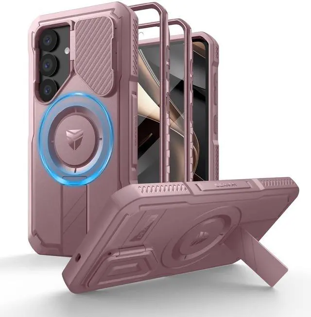 for Samsung Galaxy S25 Case with Camera Cover & Adjustable Kickstand & Built-in Screen Protector, Magnetic Rugged Shockproof Bumper Cases Heavy-Duty Magnetic Protective Cover (2025),Peony Pink