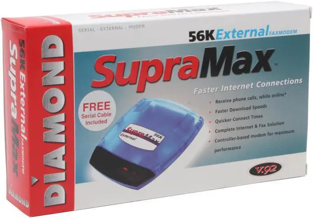 | Features | System Requirements: IBM 486 or higher Microsoft Windows 98, ME, 2000, XP, Linux and DOS Minimum 4 MB RAM, 5 MB free hard disk space CD-ROM drive Receive Phone Calls While Online Faster Download Speeds Quicker Connect Speeds Complete Internet & Fax Solution Controller-based modem for maximum performance |