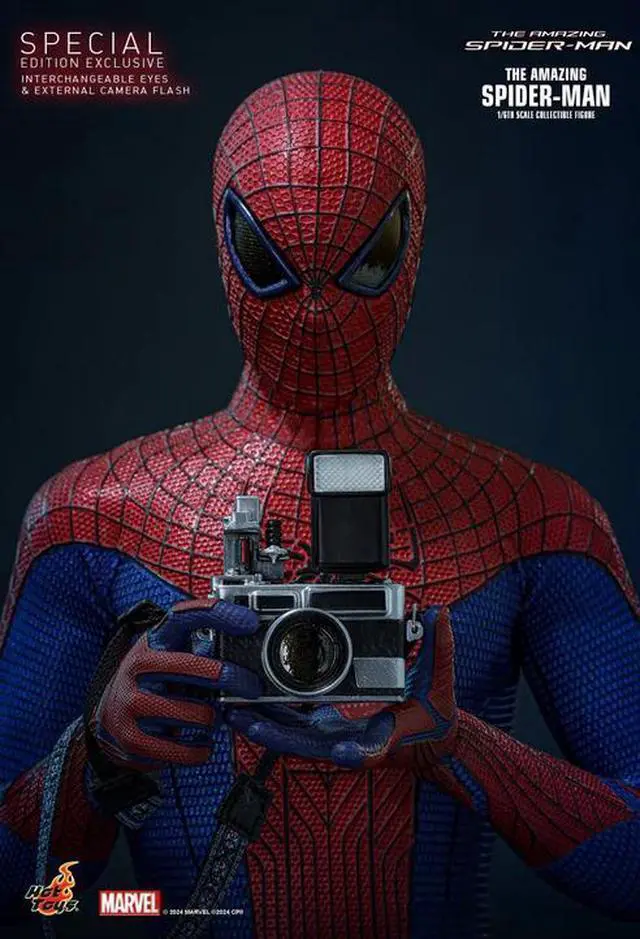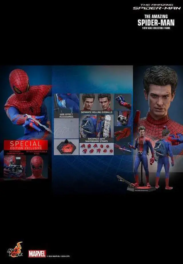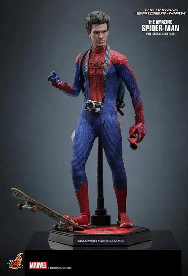 Based on the appearance of Andrew Garfields Peter Parker/ Spider-Man in the film, the meticulously crafted 1/6th scale collectible figure features a newly developed Peter Parker head sculpt with separate rolling eyeballs, a masked head sculpt; an exceptionally tailored red and blue suit with web pattern, embodied by a newly developed specialized body with enhanced articulation; a variety of accessories including a skateboard, a backpack, a cellphone, a camera with strip and a Spider-Man mask, as well as assorted webbing accessories, and a dynamic figure stand.
