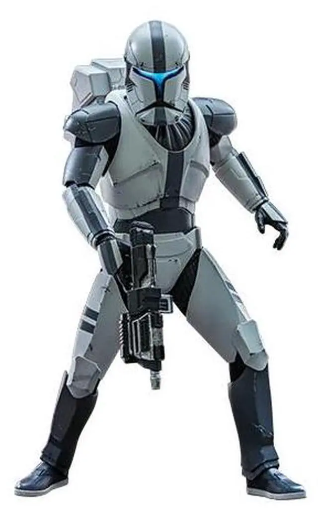 The collectible figure features a highly detailed Clone Commando armor with white and grey paint applications, a helmet with LED light-up function, a blaster rifle, a thermal detonator, a backpack, and a display base!