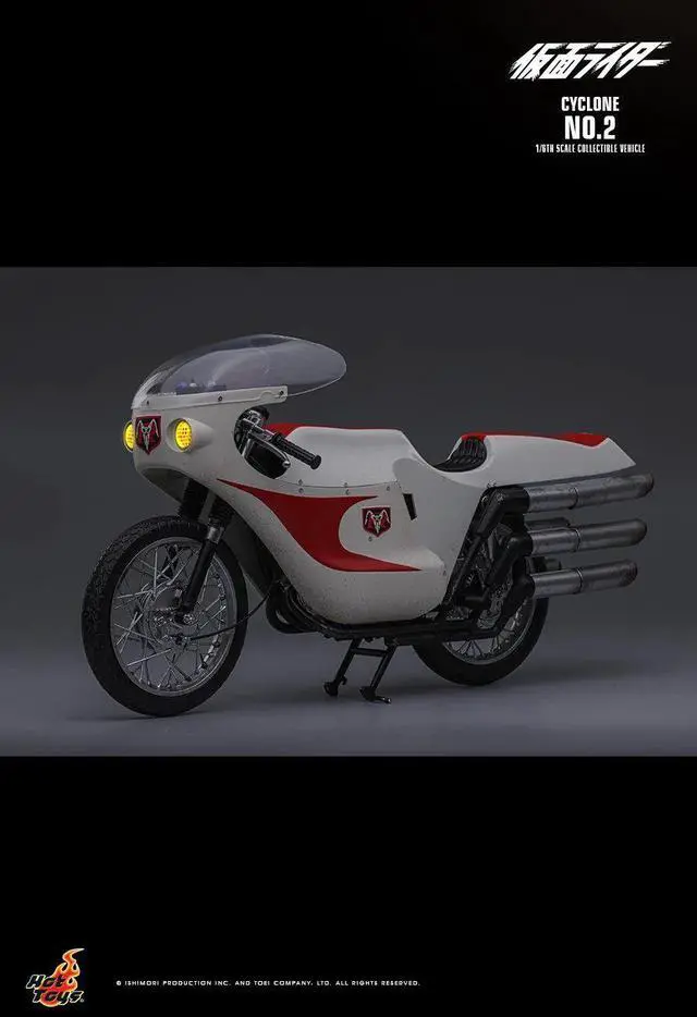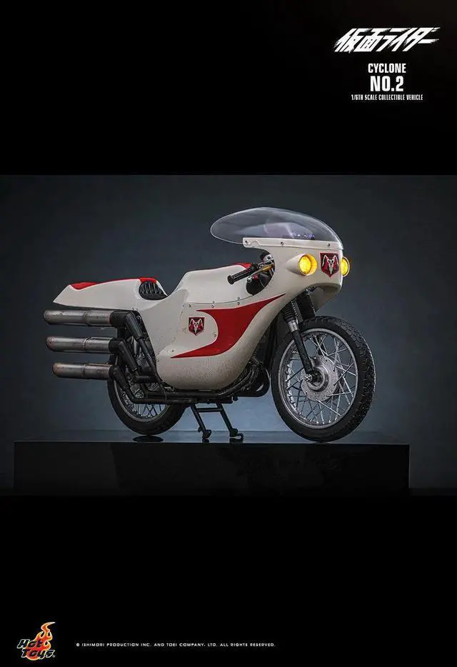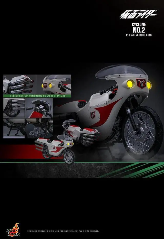 Exquisitely crafted base on Kamen Rider No. 2 s personal vehicle, Cyclone No. 2 is recreated with precision and refined details. Measuring at approximately 35.5 long, the collectible vehicle is designed with screen-accurate scaling and incredible paintworks, featuring LED-lighted headlight and rear signal light, rotatable rubber tires, working spring suspension and a specialized display base.