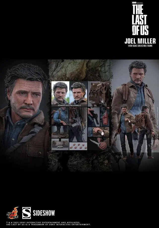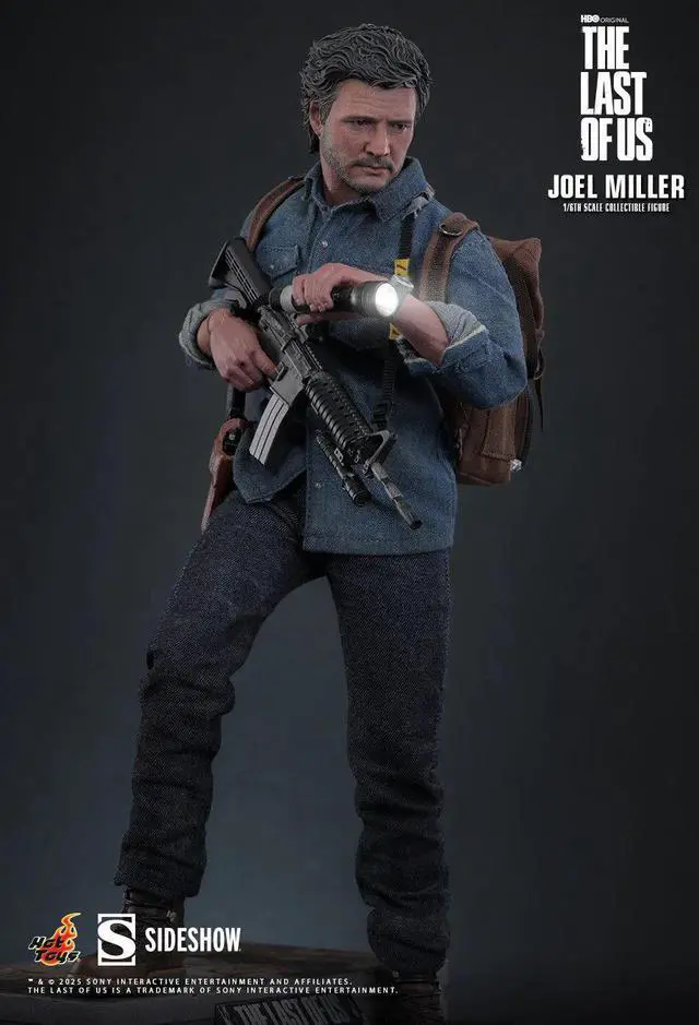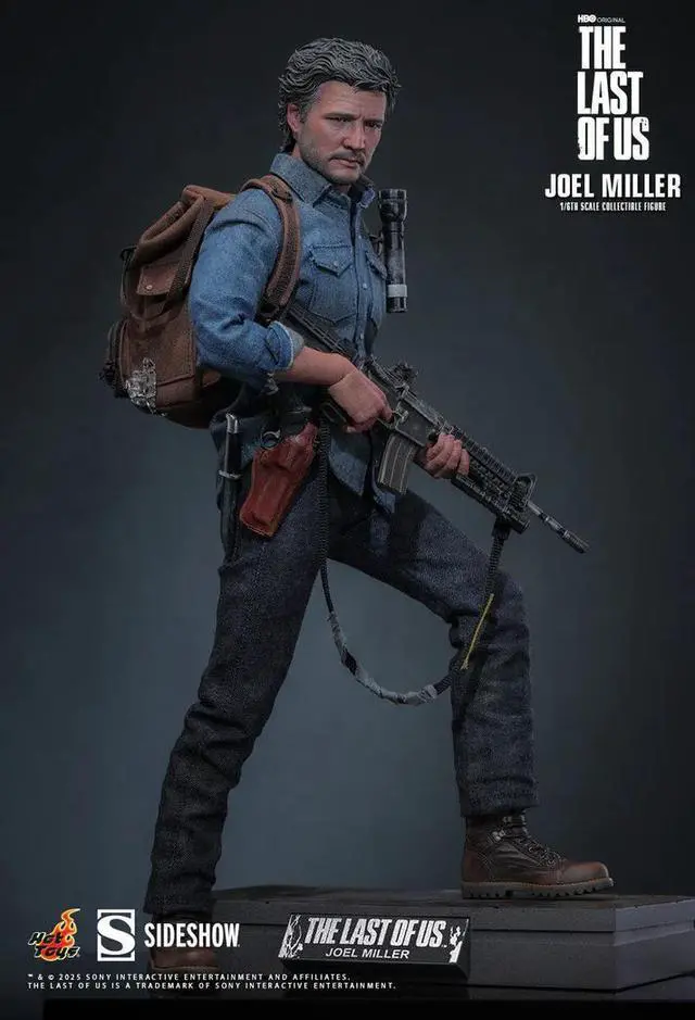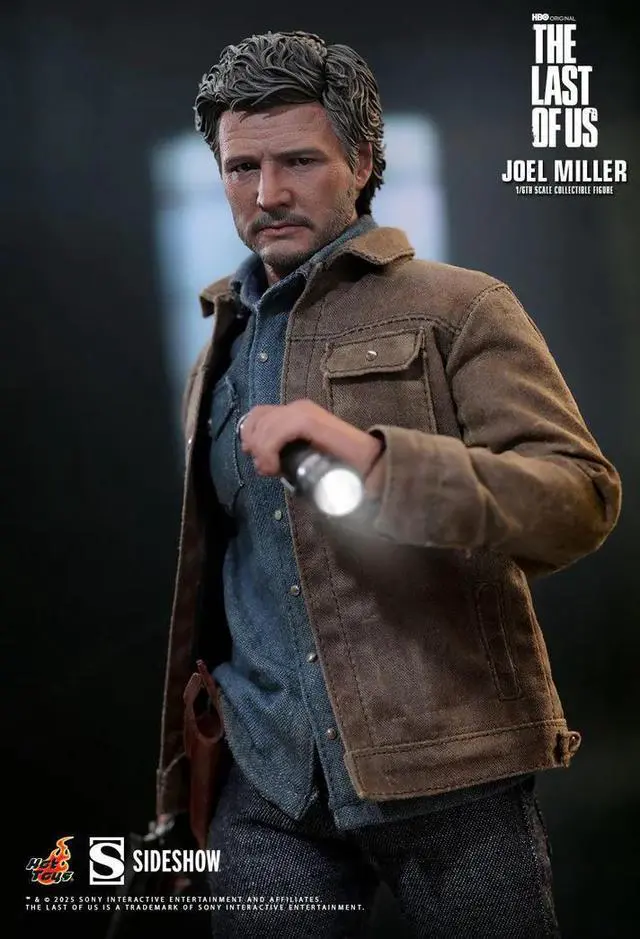 Sideshow and Hot Toys proudly present the 1/6th scale Joel Miller Collectible Figure, faithfully replicating Pedro Pascals portrayal in the hit HBO Original series. The figure features a newly developed head sculpt with separate rolling eyeballs, allowing for a calm yet weathered expression that reflects Joels weariness and emotional depth. Outfitted in his signature layered look, which includes a waxed jacket, denim shirt, jeans, shoes, and a belt equipped with a knife sheath and a pistol holster, Joel is well-prepared for survival. His weapons include a combat knife, a revolver, and a highly detailed assault rifle with a removable magazine, retractable stock, and rear sight.