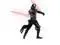 - Two (2) red lightsaber blades in motion (attachable to the hilt)