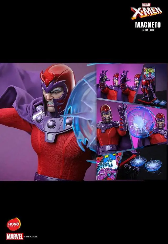 Here comes another legendary mutant action figure from HON STUDIO! Rise from the X-Men comic book series, the Magneto figure features a helmeted head, interchangeable hands and attachable color effects for power display with signature comic cover style backdrop! This 1/6th scale figures outfit is a combination of sharp red and different hues of metallic purple, embedded with detail elements. Gesture hands are equipped with a magnetic mechanism, allowing them to hold small metal accessories. Designed to showcase Magnetos iconic style in various poses, the figure comes with enhanced articulation.