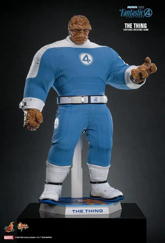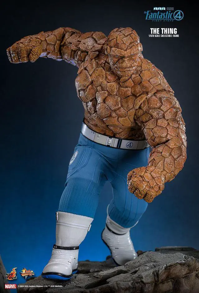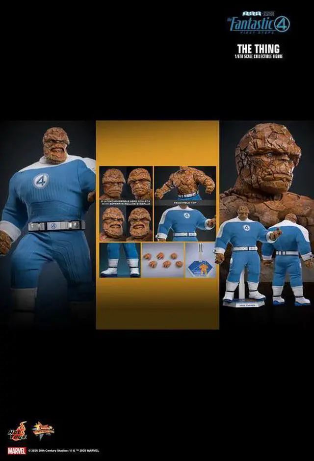 Hot Toys is proud to present the 1/6th scale The Thing Collectible Figure. The figure features a rock-like textured body. It also includes two interchangeable head sculpts, one normal version and one bearded version, both with rolling-eyeball function and texture that captures his iconic rock-like form. He wears the Fantastic Four uniform tailored in blue and white ribbed fabric, with the upper part of the suit being removable, allowing collectors to display The Thing in his classic bare-chested look. Completing the outfit is a belt bearing the Fantastic Four emblem and a pair of boots. The figure comes with six interchangeable hands, including fists, relaxed hands, and claw gesture hands for dynamic posing. Presented on a specially designed figure base, hes ready to clobber! A Special Edition only available in selected markets will include a specially designed