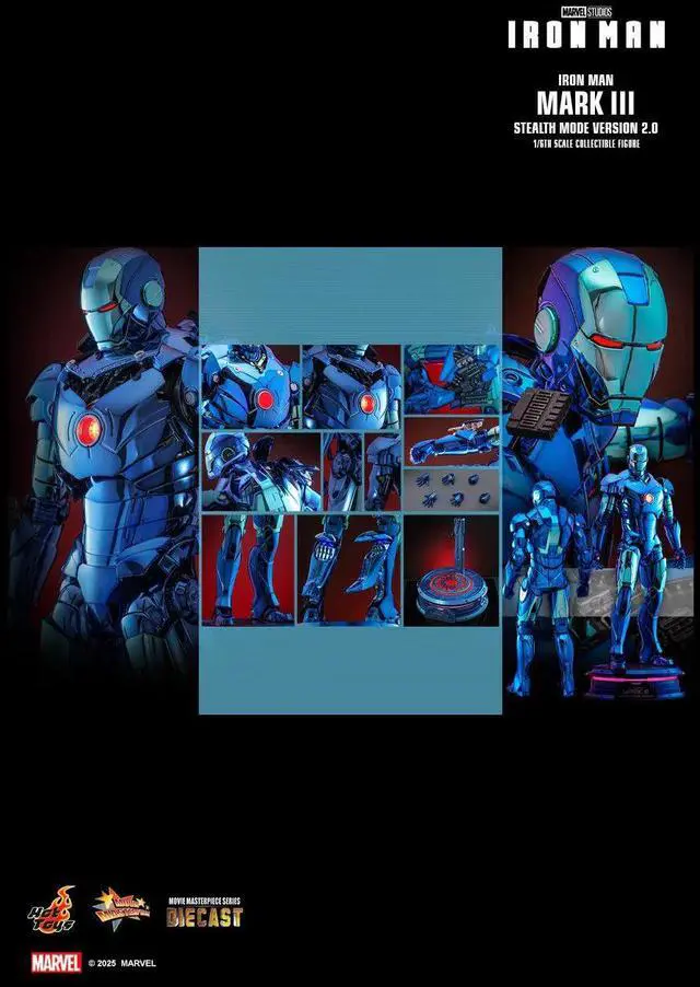 Hot Toys is thrilled to present the 1/6th scale Iron Man Mark III (Stealth Mode Version) 2.0 Collectible Figure! Expertly crafted from diecast material, this Mark III figure features a stunning two-tone metallic blue chrome color scheme and armor with a glossy, reflective finish that not only highlights the tactical coolness of the Stealth Mode design but also makes it a standout piece in any Hall of Armor display. This exclusive figure is available in a limited quantity of 2, 500 units, exclusively in selected markets.