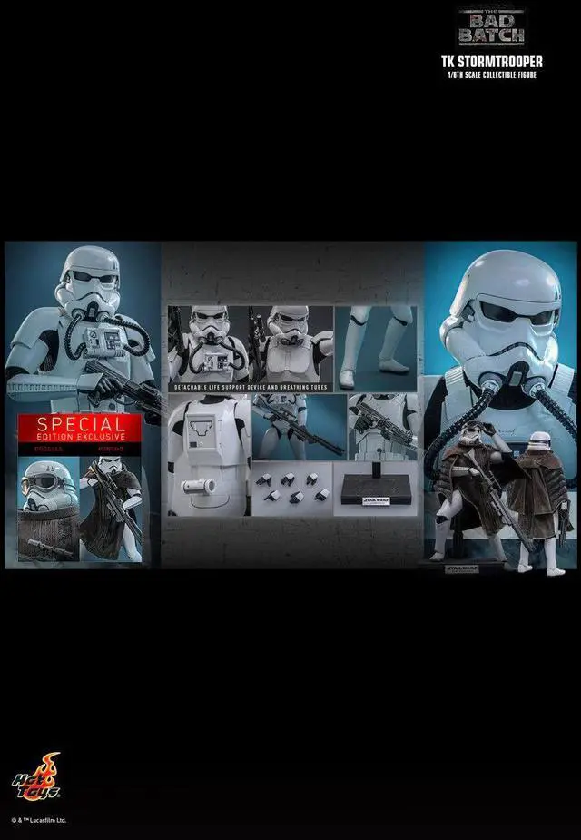 Hot Toys is excited to present the 1/6th scale TK Stormtrooper Collectible Figure. The figure features a newly crafted TK Stormtrooper helmeted head with realistic weathering effects. The costume features a newly crafted set of white and weathered TK Stormtrooper armor, a fabric undersuit, a utility belt, and a pair of boots all authentically recreated to capture the worn, early-era aesthetic seen in The Bad Batch.