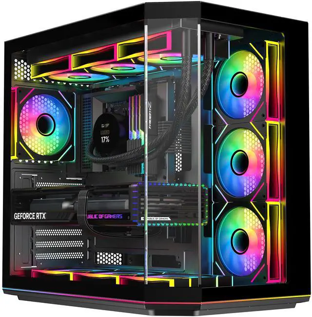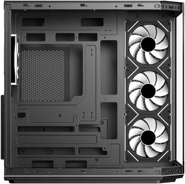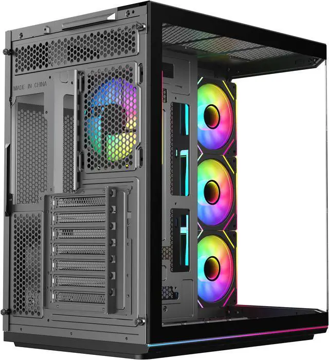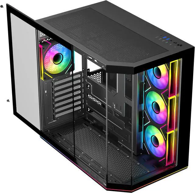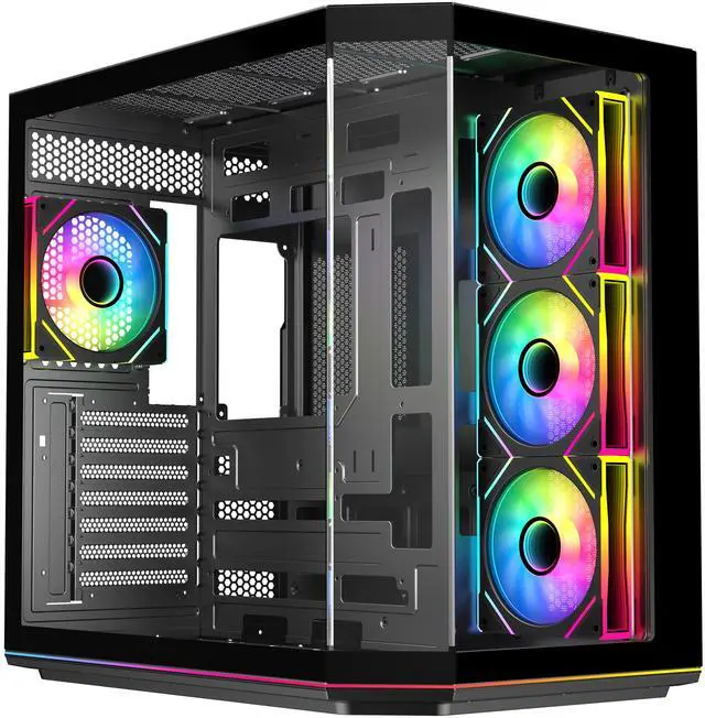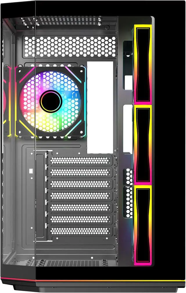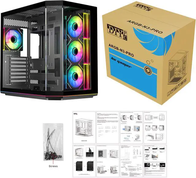 | Features | DIYPC ARGBN3-PRO is a panoramic ATX case w/3 tempered glass with a 270° full view of your masterpiece for building high-performance system. It has front and side tempered glass panel, w/top mesh design allow optimized air flow. The cases design has bigger interior space to accommodate and improve cooling performance (can support up to 420mm x GPU and 360mm radiator x top/MB side). It supports up to 200mm long full ATX power supply to run the most power hungry system. Advanced cable management design - routing the main cable is easy and quick through a hidden channel. There is a large space behind the motherboard for all cables, making the case a clean and beautiful look. 2 ways to control ARGB Fan Lighting: Either by Manual ARGB LED Button on Top I/O Panel; or if your motherboard has 5v addressable connector, this case has ARGB 5V/3 pin header ready to SYNC w/your motherboard to control ARGB lighting. ARGB HUB controller with PWM is included. Water cooling ready - MB side /Top support up to 360mm, rear support 1 x 120mm radiator Advanced bottom-mounted power supply design Top mounted IO ports - 2 x USB 3.0 / 1 x Type C for up-to-date high speed data transfer 10 fans capability (3 x 120mm ARGB reverse blade PWM fan x MB side, 1 x 120mm ARGB PWM fan x rear pre-installed) provide great cooling and gaming performance Magnetic dust filter at top - easy clean Support up to 155mm CPU cooler Support up to 420mm VGA card |