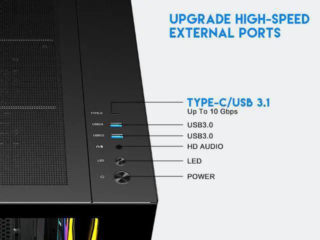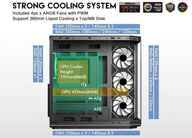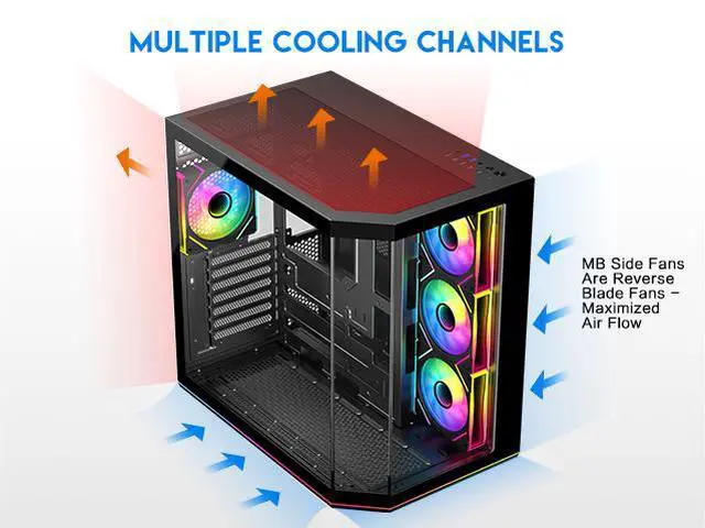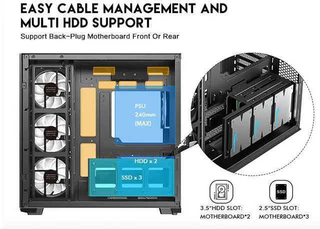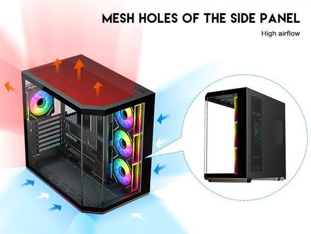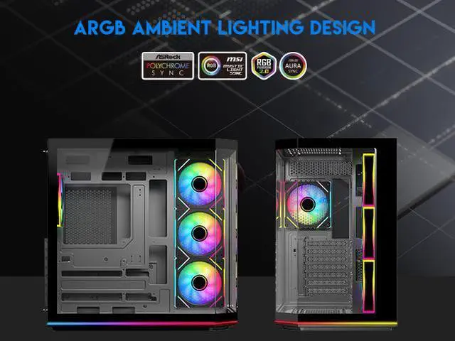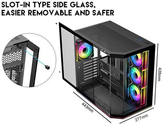 | Features | DIYPC ARGBN3-PRO is a panoramic ATX case w/3 tempered glass with a 270° full view of your masterpiece for building high-performance system. It has front and side tempered glass panel, w/top mesh design allow optimized air flow. The cases design has bigger interior space to accommodate and improve cooling performance (can support up to 420mm x GPU and 360mm radiator x top/MB side). It supports up to 200mm long full ATX power supply to run the most power hungry system. Advanced cable management design - routing the main cable is easy and quick through a hidden channel. There is a large space behind the motherboard for all cables, making the case a clean and beautiful look. 2 ways to control ARGB Fan Lighting: Either by Manual ARGB LED Button on Top I/O Panel; or if your motherboard has 5v addressable connector, this case has ARGB 5V/3 pin header ready to SYNC w/your motherboard to control ARGB lighting. ARGB HUB controller with PWM is included. Water cooling ready - MB side /Top support up to 360mm, rear support 1 x 120mm radiator Advanced bottom-mounted power supply design Top mounted IO ports - 2 x USB 3.0 / 1 x Type C for up-to-date high speed data transfer 10 fans capability (3 x 120mm ARGB reverse blade PWM fan x MB side, 1 x 120mm ARGB PWM fan x rear pre-installed) provide great cooling and gaming performance Magnetic dust filter at top - easy clean Support up to 155mm CPU cooler Support up to 420mm VGA card |
