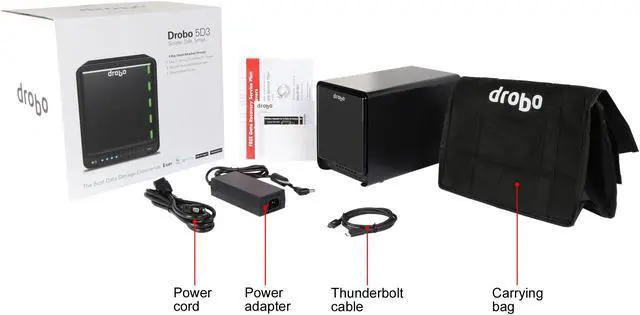 Drobo 5D3 3.3 ft. (1m) Thunderbolt 3 cable 6 ft. (1.8m) power cord with power supply Quick Start Card
