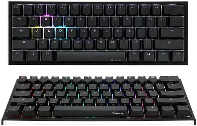 | Features | Version 2: Features 2 more LED's placed under the spacebar for more even light distribution; Improved design of PCB for enhanced connection stability; increased functionality from DIP switch Genuine Cherry MX Silent Red Switches These lightweight linear switches feature silicone injection molded components which soften the sound making them great for office users New RGB Interface - The new interface allows you to now customize the RGB lighting via software while still being able to customize it manually without software on the physical keyboard Double Shot Keycaps - Experience comfort and clarity with Duckys double shot molded keycaps made from PBT and ABS plastics. The absolute best keycaps for the office, casual use and for gaming True RGB Backlighting - Customize your backlighting with complete RGB customization. Use the single key function to map out zones, and choose the exact colour with Ducky's RGB blending functions The Ducky One 2, now available in a minimalist 60% keyboard form factor for the typists who would rather have a clean desk space rather than extra keys |