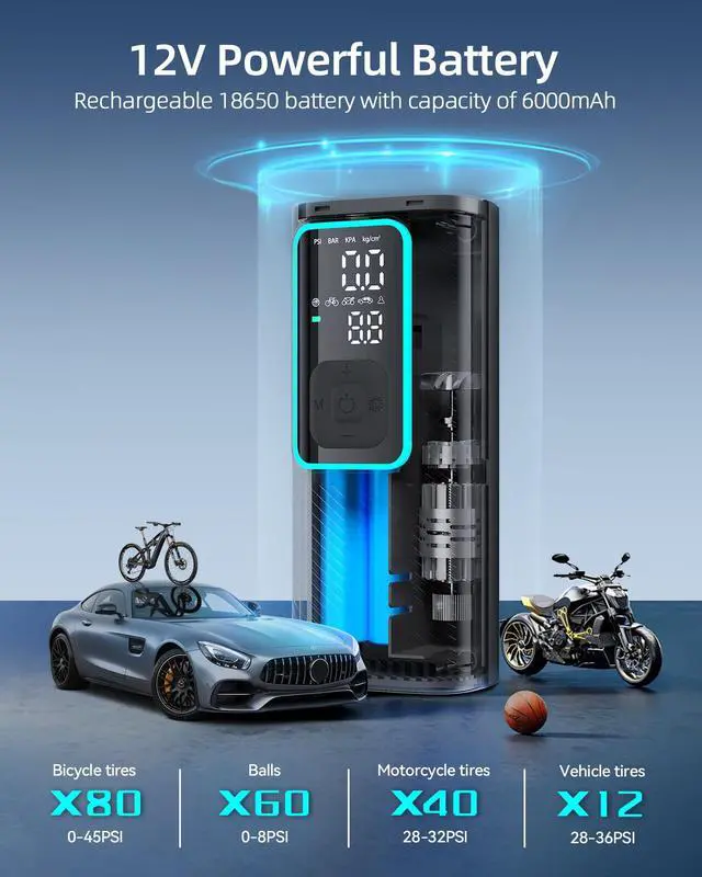 The EBOSSOM Tire Inflator has a maximum capacity of 150 PSI. It is suitable for inflating a variety of items, including car tires, motorcycle tires, bike tires, sports balls, and swiming rings.