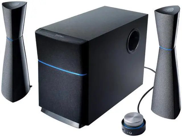 | Features | Uniquely designed, 2.1 audio system capable of hosting multiple audio sources via 3.5mm auxiliary input Wooden enclosed, magnetically shielded subwoofer with 5½ inch driver Elegantly designed, magnetically shielded 2-way satellites Wired rotary master volume controller with "red-halo" effect, including headphone jack for convenience. |
