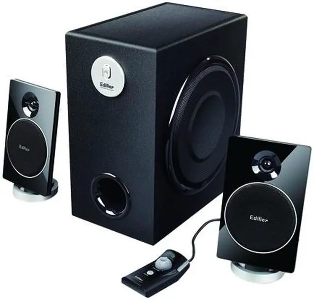 | Features | 2-way driver, super flat panel satellite design 6½ inch magnetically shielded side-firing subwoofer Front hyperbolic bass port with wooden enclosed subwoofer Wired remote control with volume, mute, line-in, headphone jack and LED power indicator Auxiliary input feature adds additional source input Magnetically shielded 3 inch midrange speakers and 10mm tweeters |