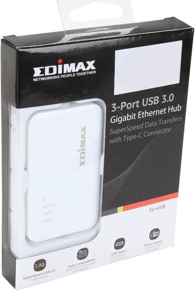 | Package Contents | 1 x EU-4308 USB-C to 3-Port USB 3.0 Gigabit Ethernet Hub 1 x Quick Installation Guide CD (Multi-Language Quick Installation Guide) |