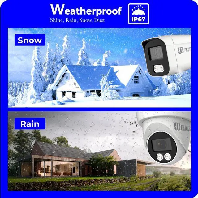 [Weatherproof Heavy-Duty Housing IP67] This systems cameras are suitable for anywhere, outdoor or indoor installation. The weatherproof rating and heavy-duty exterior add extra protection against vandalism and harsh weather, providing you truly year-round protection. Elder weatherproof cameras can withstand pretty much anything, such as snowfalls, rain, dust, heat, and wind, all year round.