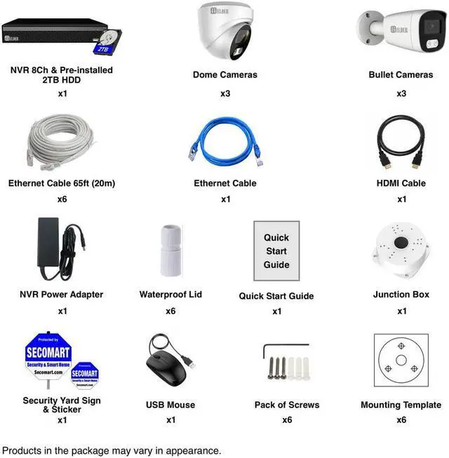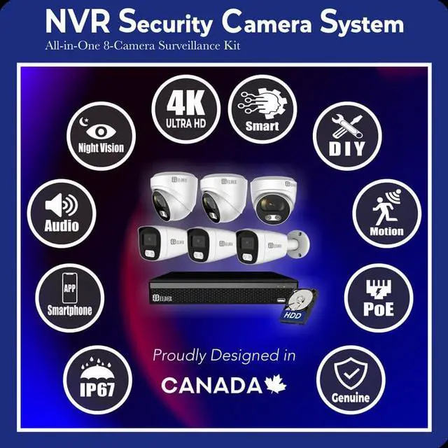 • Keep a watchful eye over your home & business with Elder 4K security camera system 8MP from Hunter-LE series, which is a PoE NVR security camera system outdoor & a 6-camera DIY surveillance camera system wired plug-&-play featuring intelligent detection, audio, H.265, & free app for remote viewing. Elder 4K security camera system includes 8Ch PoE NVR 4K with 2TB HDD pre-installed, 6pcs 4K cameras dome & bullet, a junction box, cables & accessories. Proudly Designed in Canada