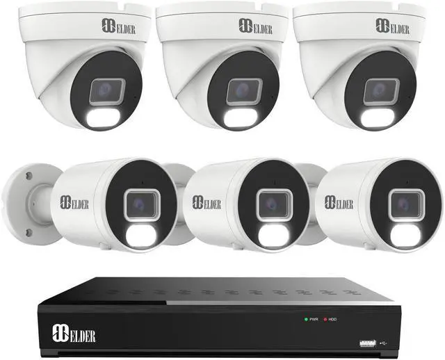 • Elder 4K security camera system wired Hunter-HE series is a PoE NVR security camera system designed for a home and business. This 4K surveillance camera system features 8MP resolution, dual-light night vision full-color and IR, motion-activated spotlight, listen-in audio, person and vehicle motion detection, local storage, and a free app for remote viewing, and it is compatible with Hey Google and Alexa. With PoE NVR and Ethernet cables, installation is simple, making it a user-friendly DIY plug-&-play camera system. Metal housing cameras and IP66 weatherproof rating, make them ideal for outdoor or indoor areas.