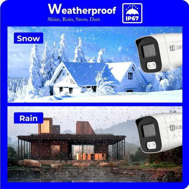 Weatherproof Heavy-Duty Housing IP67 This systems cameras are suitable for anywhere, outdoor or indoor installation. The weatherproof rating and heavy-duty exterior add extra protection against vandalism and harsh weather, providing you truly year-round protection. Elder weatherproof cameras can withstand pretty much anything, such as snowfalls, rain, dust, heat, and wind, all year round.