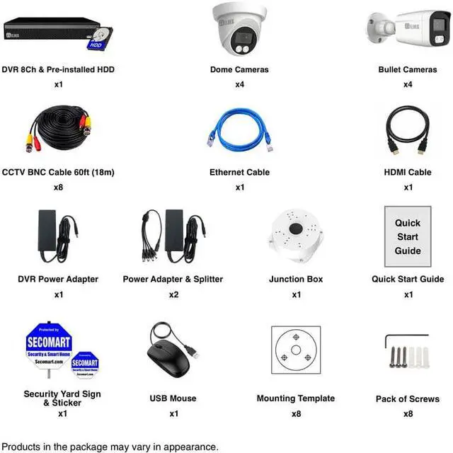 • Keep a watchful eye over your home & business with Elder 4K security camera system 8MP Color Night Vision Spotlight from Hunter-LE series, which is a DVR security camera system outdoor DIY & a full-color surveillance camera system wired plug-&-play featuring intelligent detection, audio, H.265 & free app for remote viewing. It includes 8ch DVR with 3TB HDD pre-installed, 8pcs 4K spotlight cameras dome & bullet, a junction box, cables & accessories. Proudly Designed in Canada