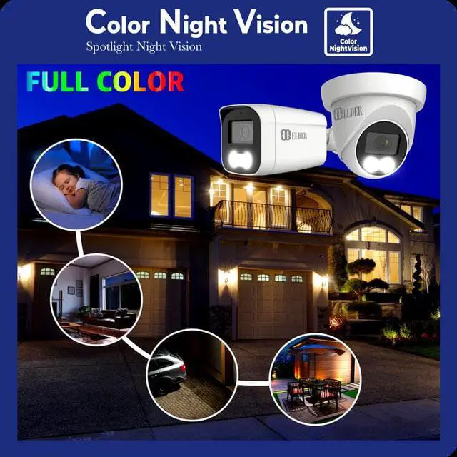 [Color Night Vision, Full-Color NV] Elder security camera system color night vision spotlight allows you to get full-color images even in extremely low-light conditions with the state-of-the-art spotlight night vision technology, and clear black & white video footage during total darkness. Full-Color Night Vision technology brings you a higher level of security and enhances image qualities in the nighttime.