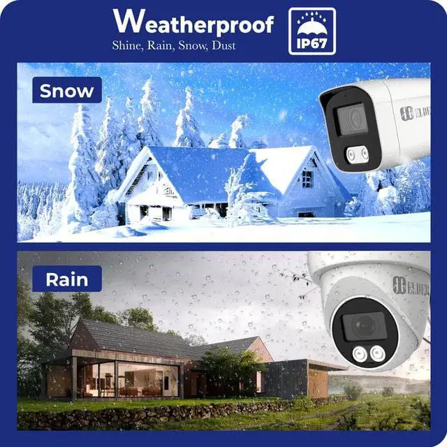 [Weatherproof Heavy-Duty Housing IP67] This systems cameras are suitable for anywhere, outdoor or indoor installation. The weatherproof rating and heavy-duty exterior add extra protection against vandalism and harsh weather, providing you truly year-round protection. Elder weatherproof cameras can withstand pretty much anything, such as snowfalls, rain, dust, heat, and wind, all year round.