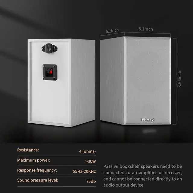 Elimavi Passive Bookshelf Speakers, 2-Way Design with 4" Woofer, 60Hz Bass, Ideal for Home, Office & Theater, White(Requires Amplifier or Receiver to Operate)