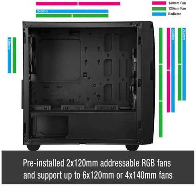 Pre-installed 2x120mm addressable RGB fans in the front and 1x120mm fan at the rear for efficient cooling.