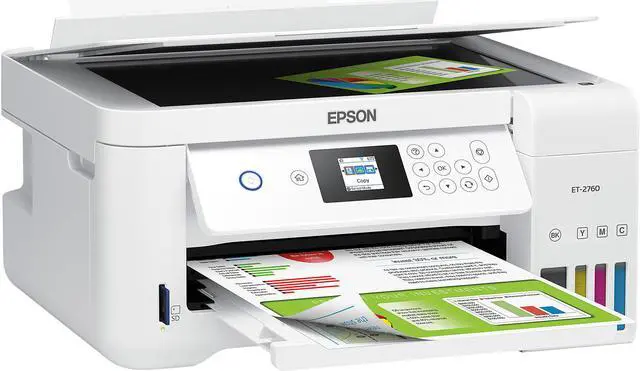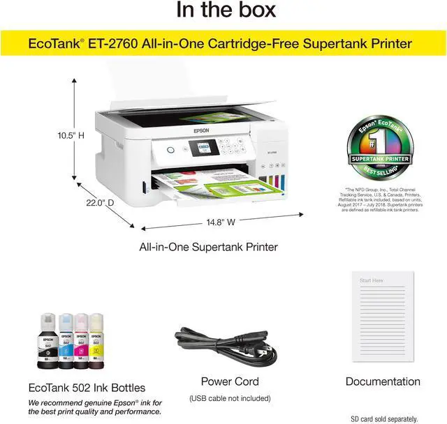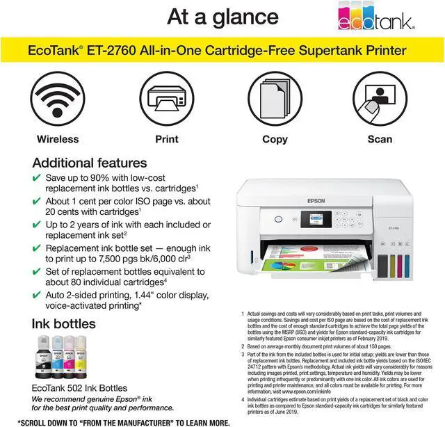The EcoTank ET-2760 offers Cartridge-Free Printing with easy-to-fill, supersized ink tanks. You can save up to 90 percent with low-cost replacement ink bottles costing as little as 1 cent per color ISO page versus 20 cents with ink cartridges1. Plus, you can get up to 2 years of ink with the included or a replacement ink set2. Each replacement ink bottle set includes enough ink to print up to 7, 500/6, 000 pages (bk/clr)3 equivalent to about 80 individual cartridges4. That means less waste and fewer trips to the store. Exclusive uniquely keyed EcoFit bottles make it easy to fill each color tank.