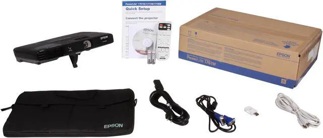 PowerLite 1761W projector Wireless LAN module Power cable Computer cable (VGA) Projector remote control with batteries USB cable Soft carrying case User manual CD EasyMP software CD Quick setup sheet PrivateLine support card Registration card Password protection sticker Security screw