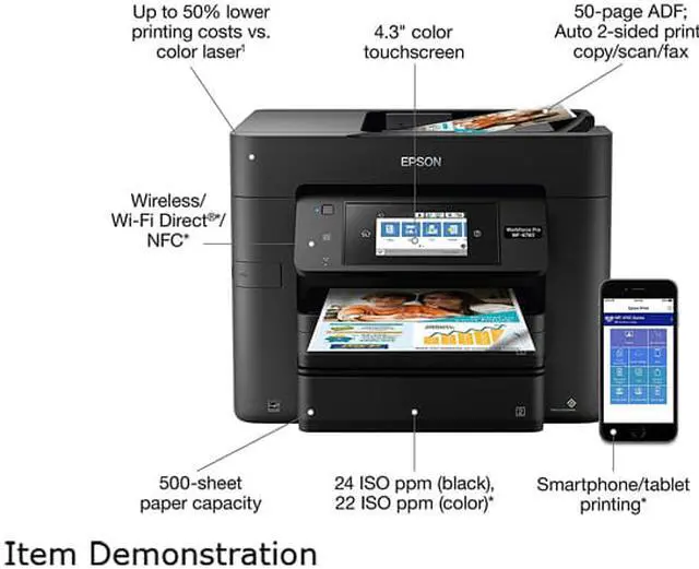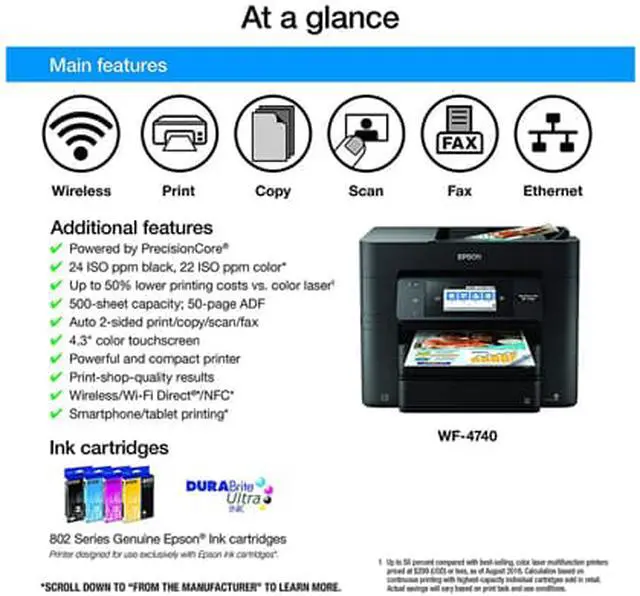 The high-speed, heavy-duty all-in-one printer for ultimate productivity. Get heavy-duty performance for your busy workgroup with the WorkForce Pro WF-4740 all-in-one printer. Powered by revolutionary PrecisionCore technology, the WF-4740 delivers Performance Beyond Laser. Featuring the fastest color print speed in its class and a 500-sheet paper capacity, it's perfect for high-volume printing - with two trays for hassle-free versatility. And, it's economical, offering up to 50 percent lower printing costs vs. color laser. Save time with its 50-page Auto Document Feeder and auto 2-sided printing, copying, scanning and faxing.