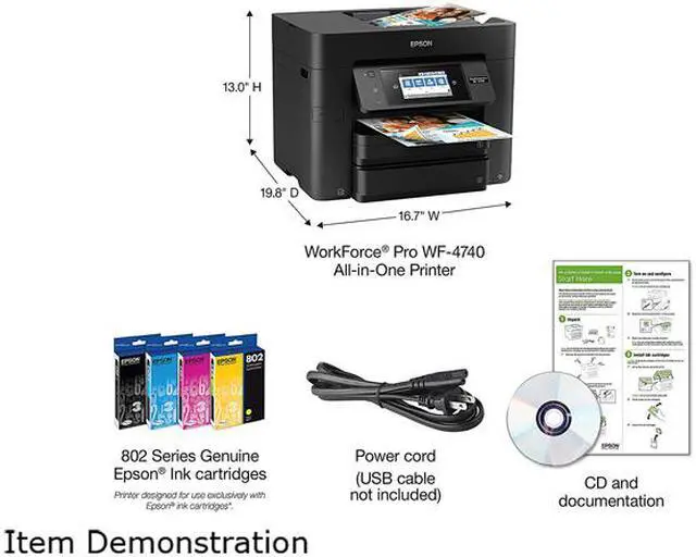 Contents: WorkForce Pro WF-4740 All-in-One Printer Instruction booklet CD-ROM with drivers Power cord 4 x DURA