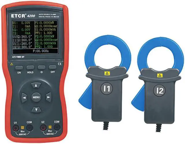 ETCR4200 Large Caliber Double Clamp Digital Phase Voltmeter (Automatic Double Clamp Digital Phase Voltmeter) is a multifunctional, digital and intelligent instrument specially developed by our company for field testing,is a comprehensive upgrade to the mechanical knob type phase voltmeter, which reduces the complexity of operation and the possibility of misoperation, with high accuracy, high stability and low power consumption. Under the condition of the tested circuit does not open-loop, it can measurement of three-phase AC voltage, current, phase between voltages, phase between current, phase between current and voltage, frequency, phase sequence, active power, reactive power, apparent power, power factor, current vector sum, judge transformer wiring group, sensibility and capacitive circuit, test the secondary circuit and differential bus protection system, read the phase relationship between differential protection between each groups CT, check watt hour meter wiring correctly or not, maintenance line equipment, etc., To provide a safe, accurate and convenient new power meter for electricity inspectors.